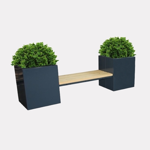 in piatto. La seduta è fissata alle fioriere tramite viti. Fioriere laterali con dimensioni 60x60x75 cm realizzate da uno scatolato in lamiera tagliata al laser e piegata. La parte superiore è ricavata dalla piega della lamiera e